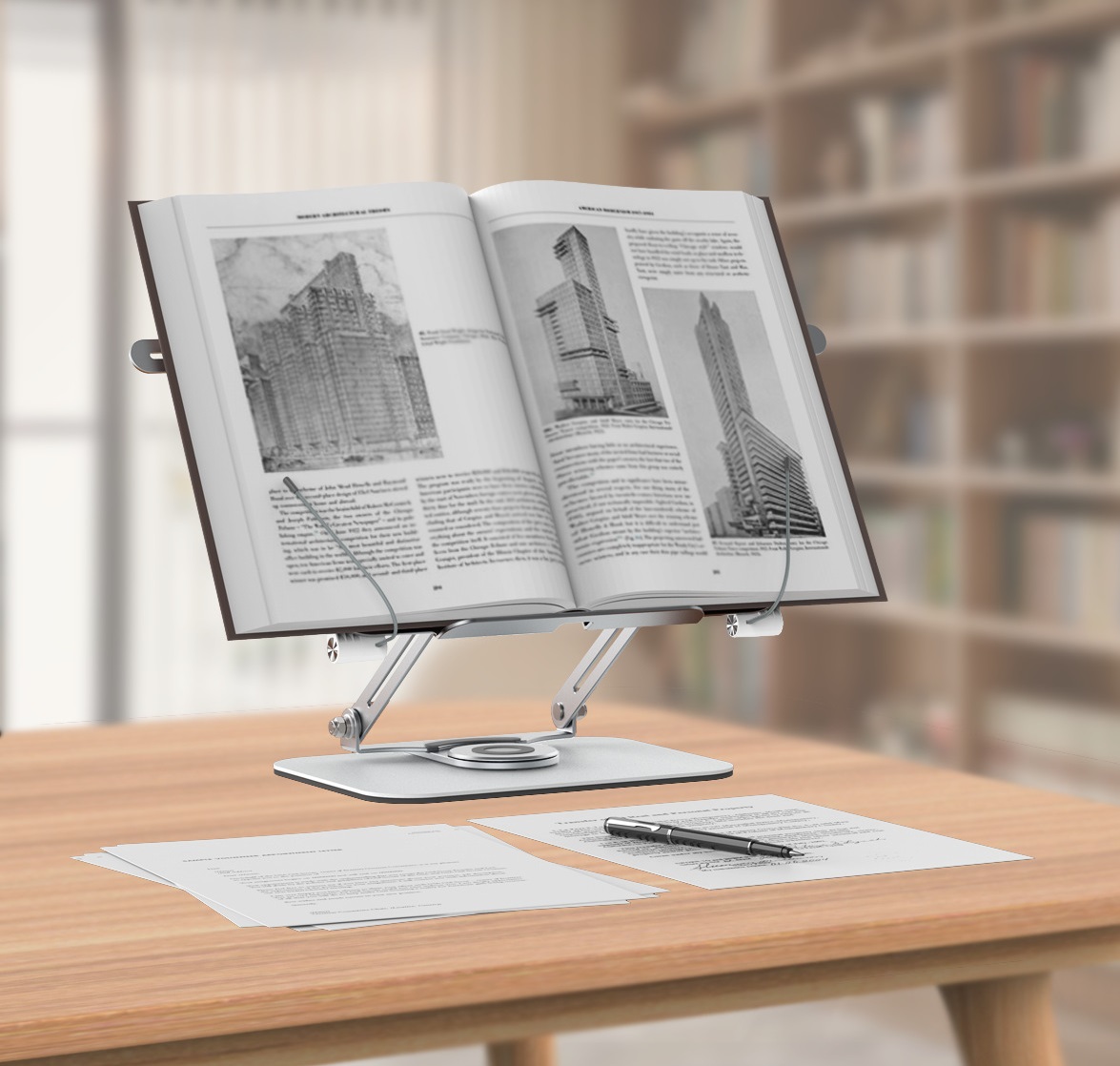 - Kết cấu bền bỉ: đế thép nặng, thân nhôm chắc; kẹp sách ABS giữ trang ổn định.
